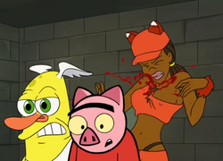 Coyote - Brain impaled with a toy gun. Deaths on Gryzule Wolfbon Timeline. Looks like Ill be enjoying the Drawn Together Gang in hell.